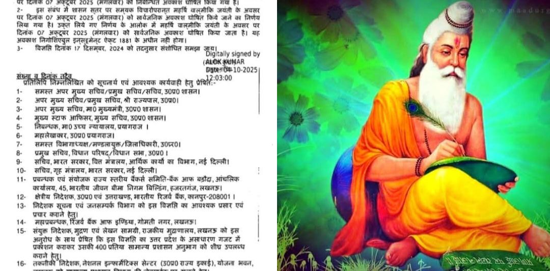 लखनऊ उत्तर प्रदेश: उत्तर प्रदेश सरकार ने समाज और संस्कृति में अमूल्य योगदान देने वाले महर्षि वाल्मीकि की जयंती के अवसर पर 07 अक्टूबर 2025 (मंगलवार) को सार्वजनिक अवकाश घोषित किया है।
